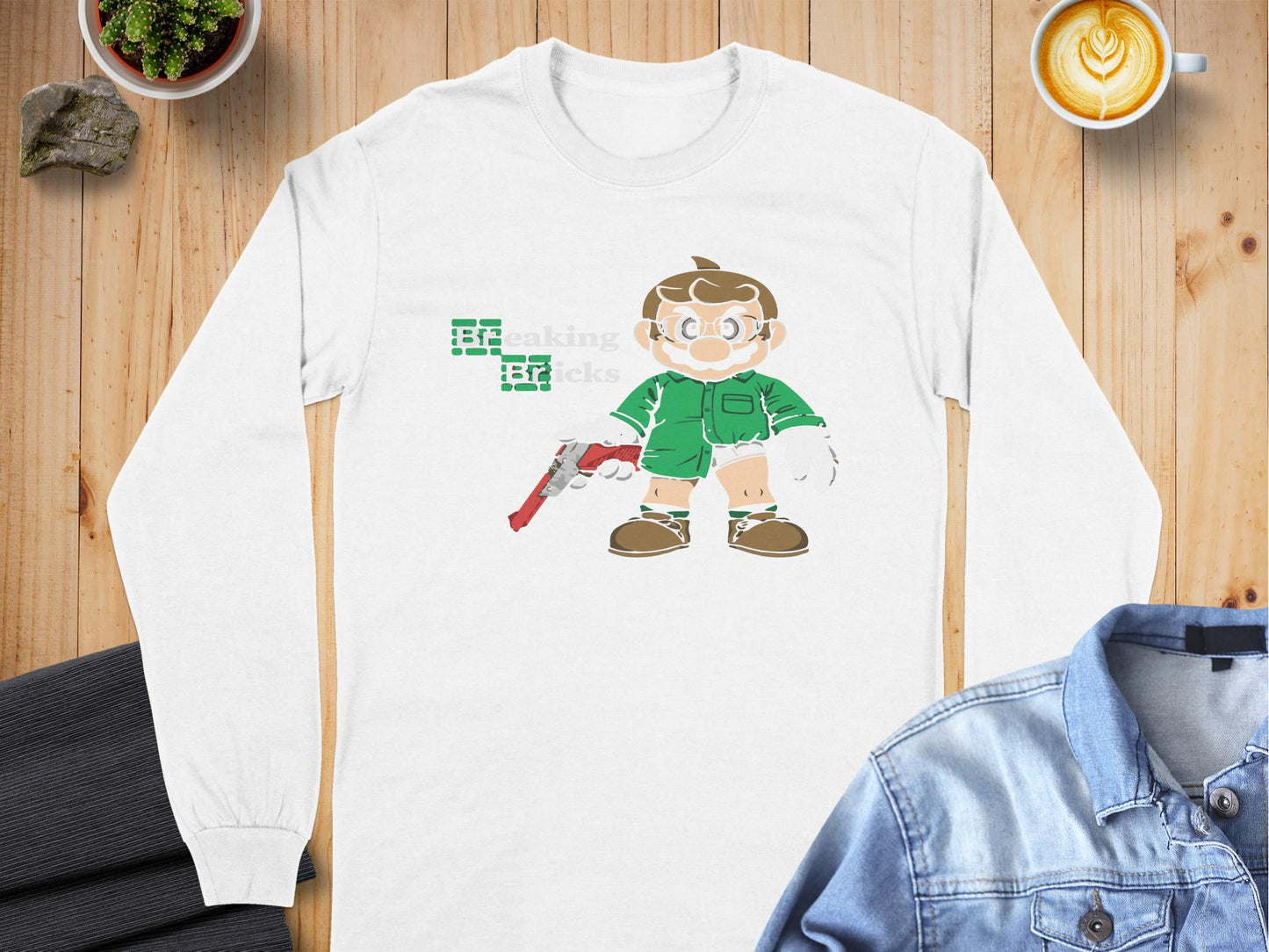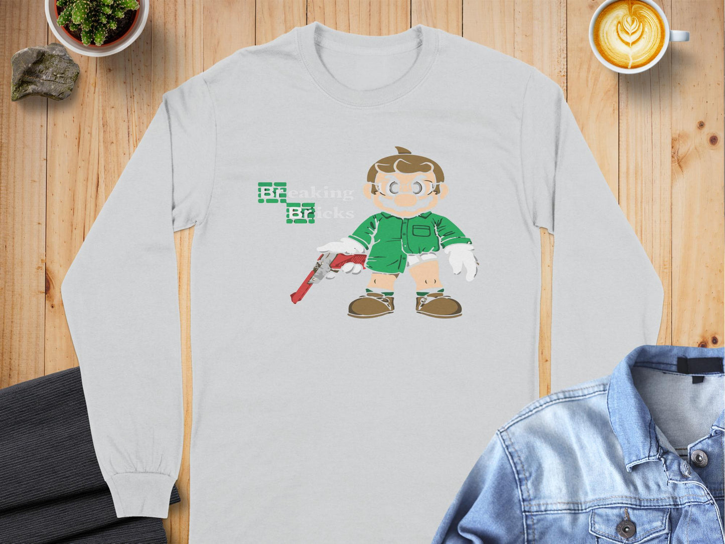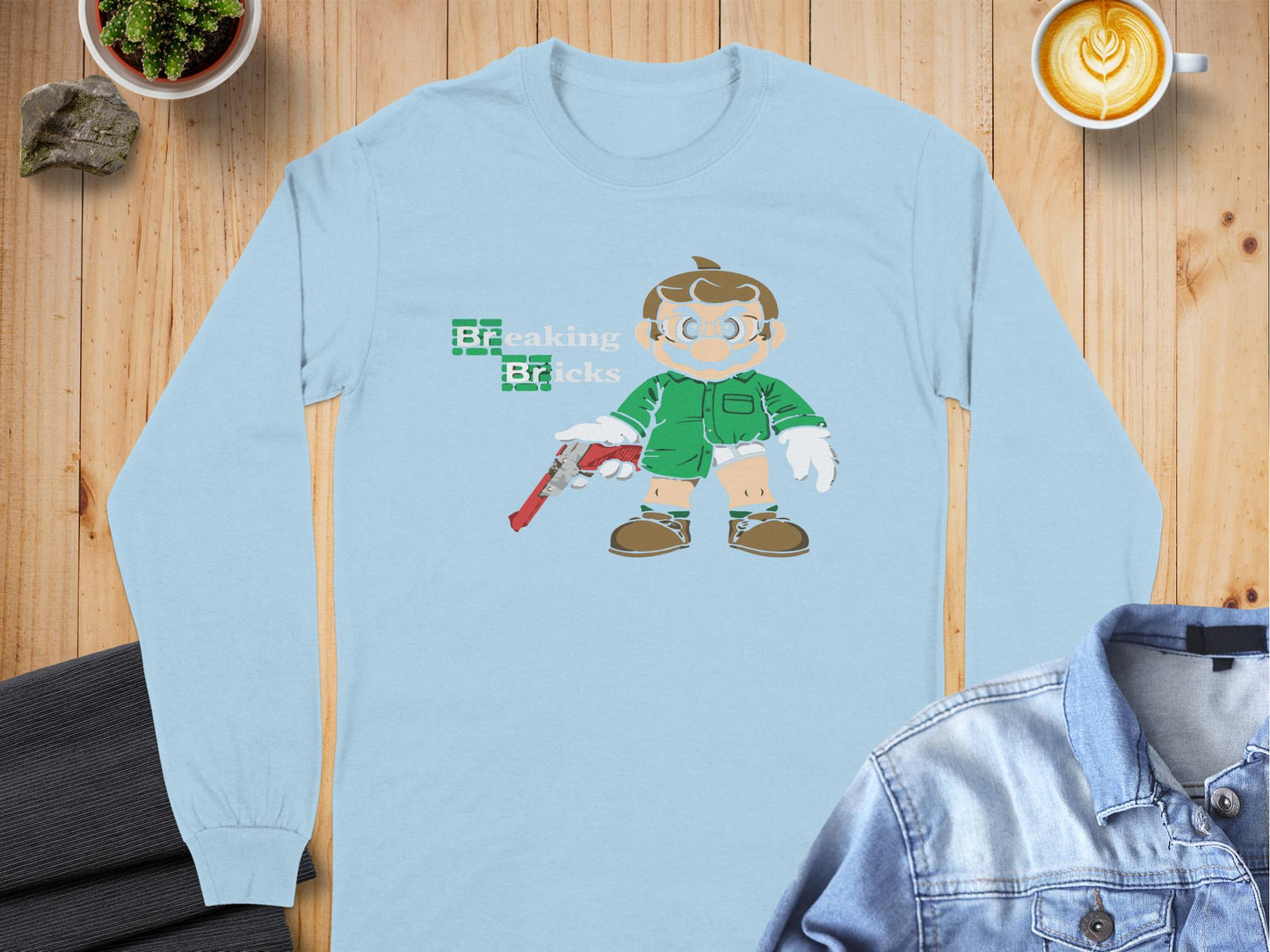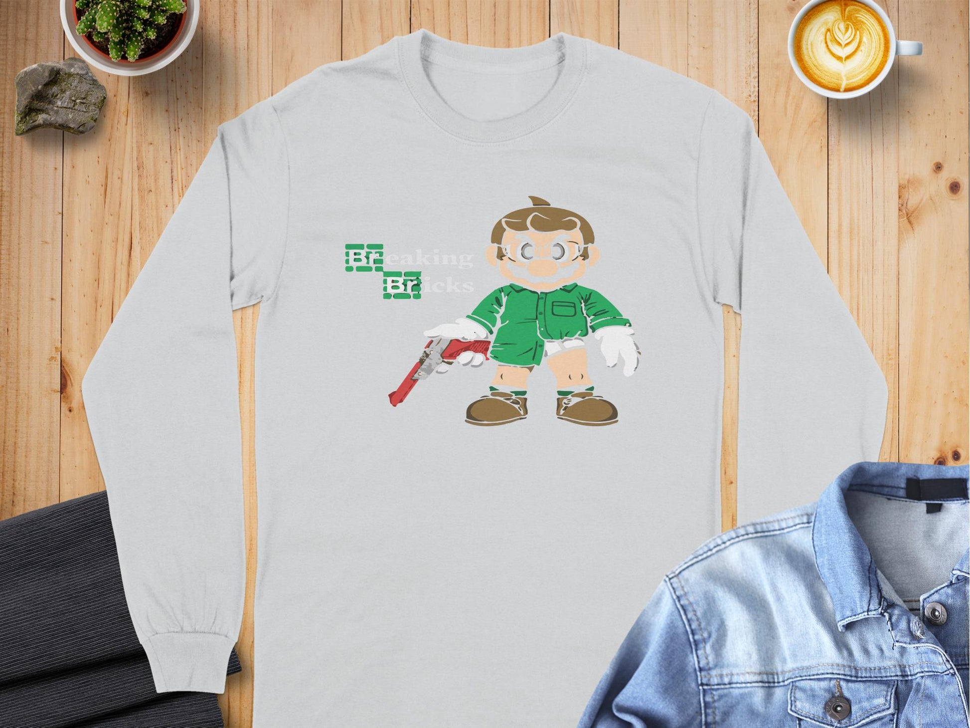 Unique and fun Breaking Bricks character graphic long sleeve t-shirts are perfect for pop culture enthusiasts looking to showcase a playful style