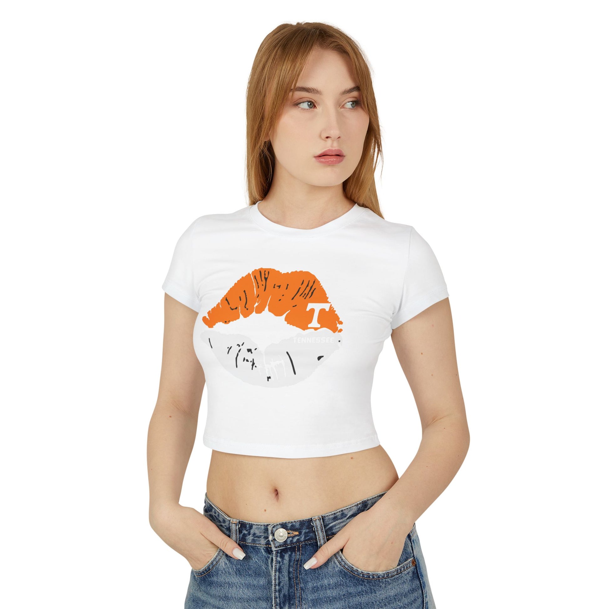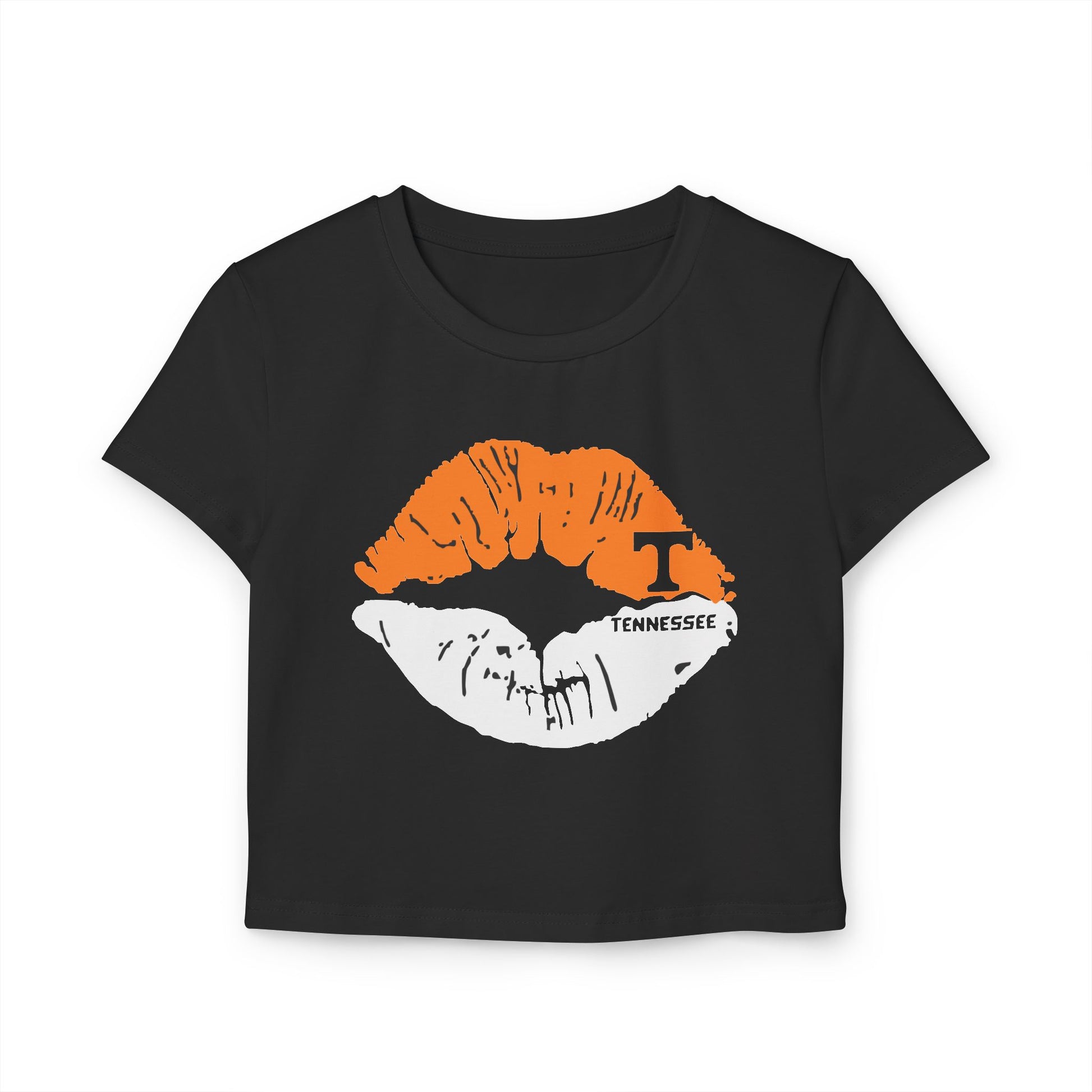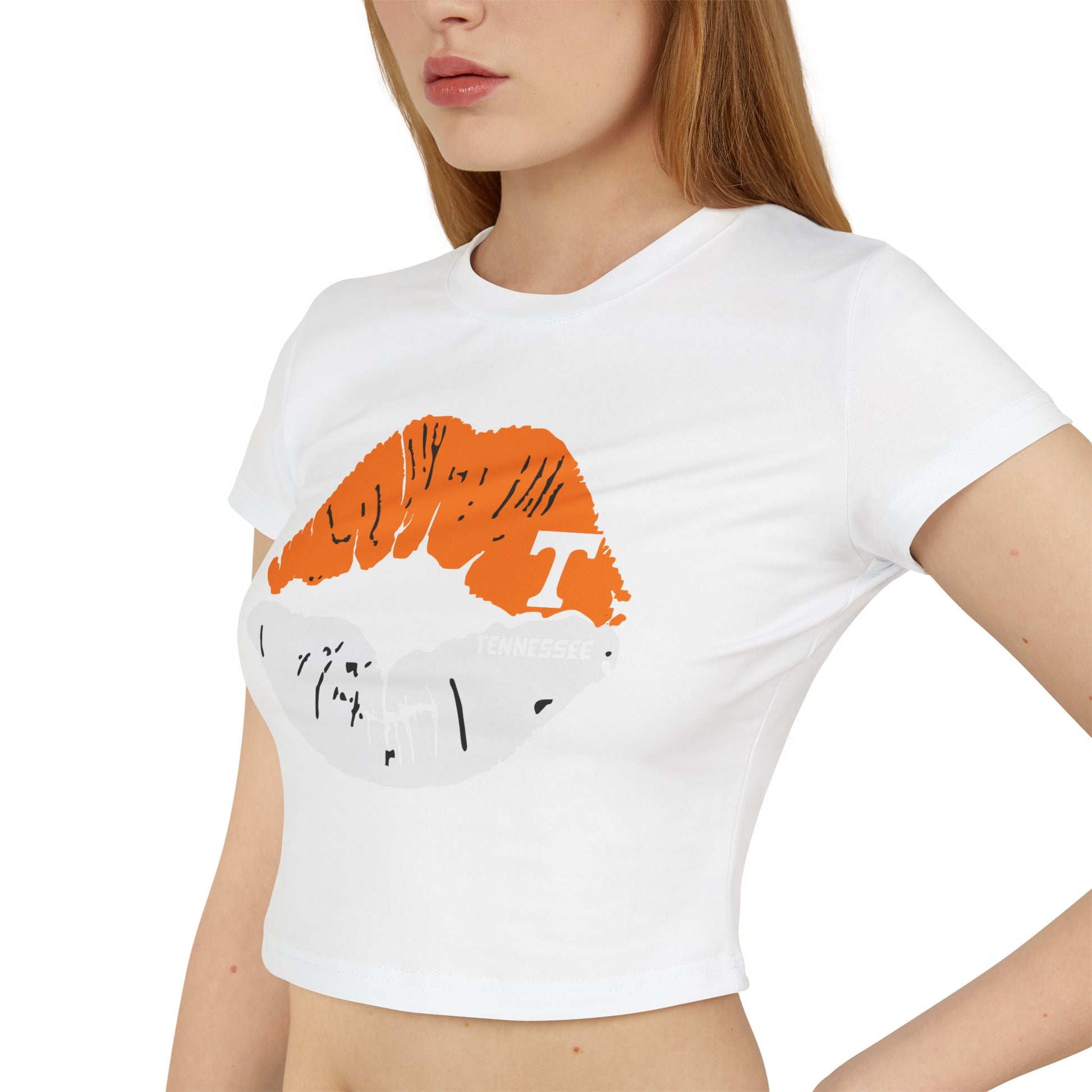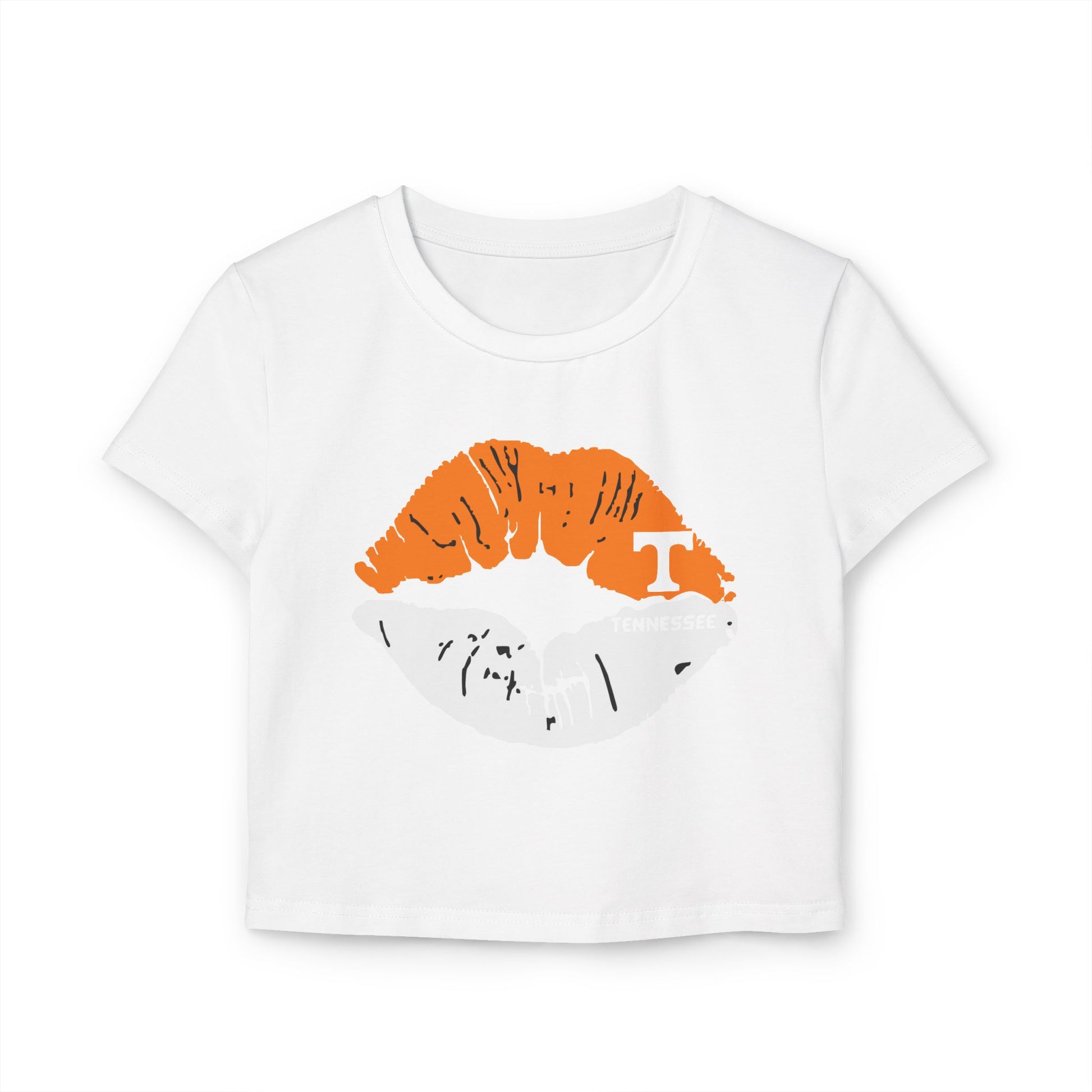 Stylish Tennessee Vols Women's Baby Tee with Lip Print, perfect for casual outings. Ideal gift for her on birthdays or Valentine's Day. Suitable for everyday wear, giving off trendy vibes. Target audience: Female fans of Tennessee Vols and fashion-forward individuals. Relevant for birthdays, Valentine's Day, casual outings.