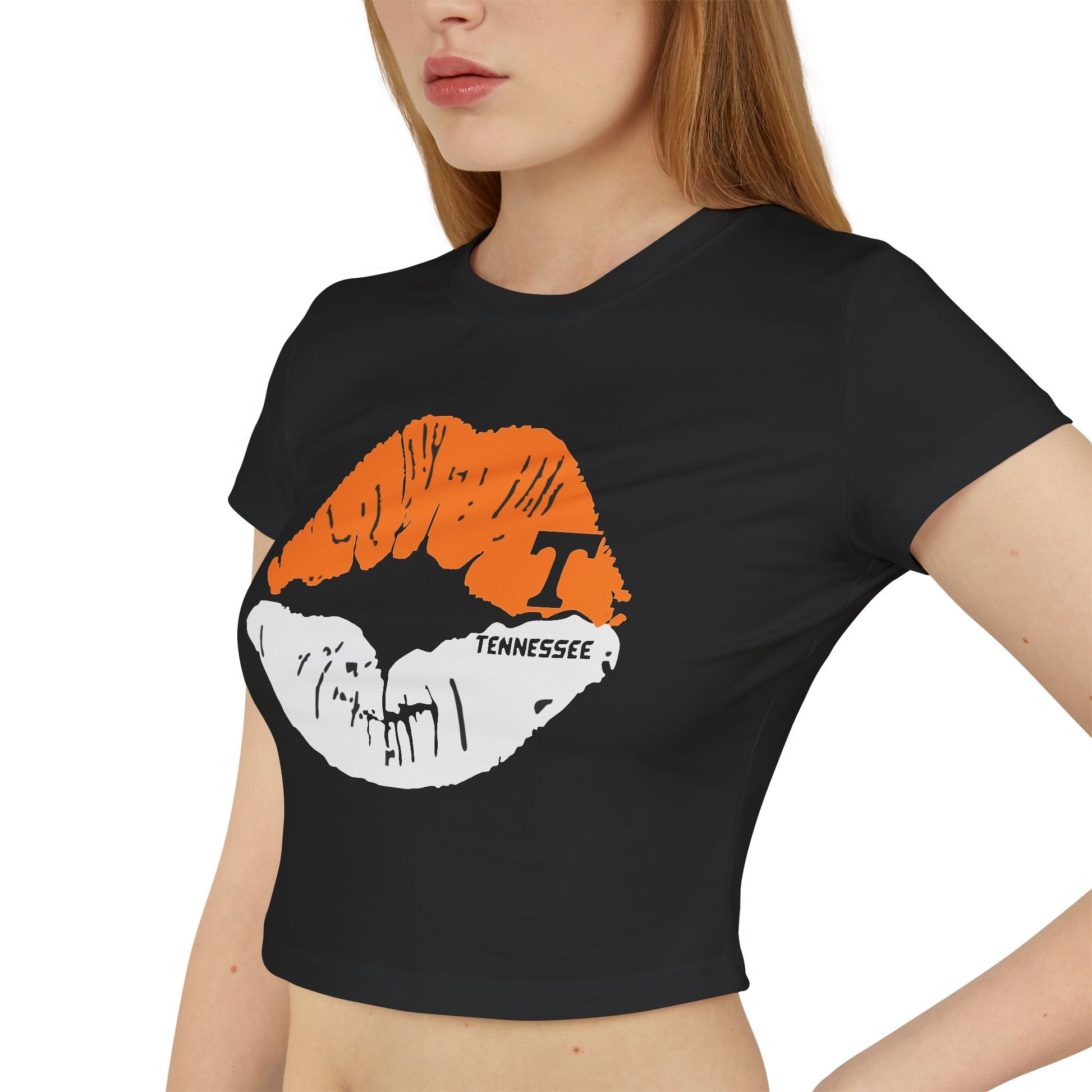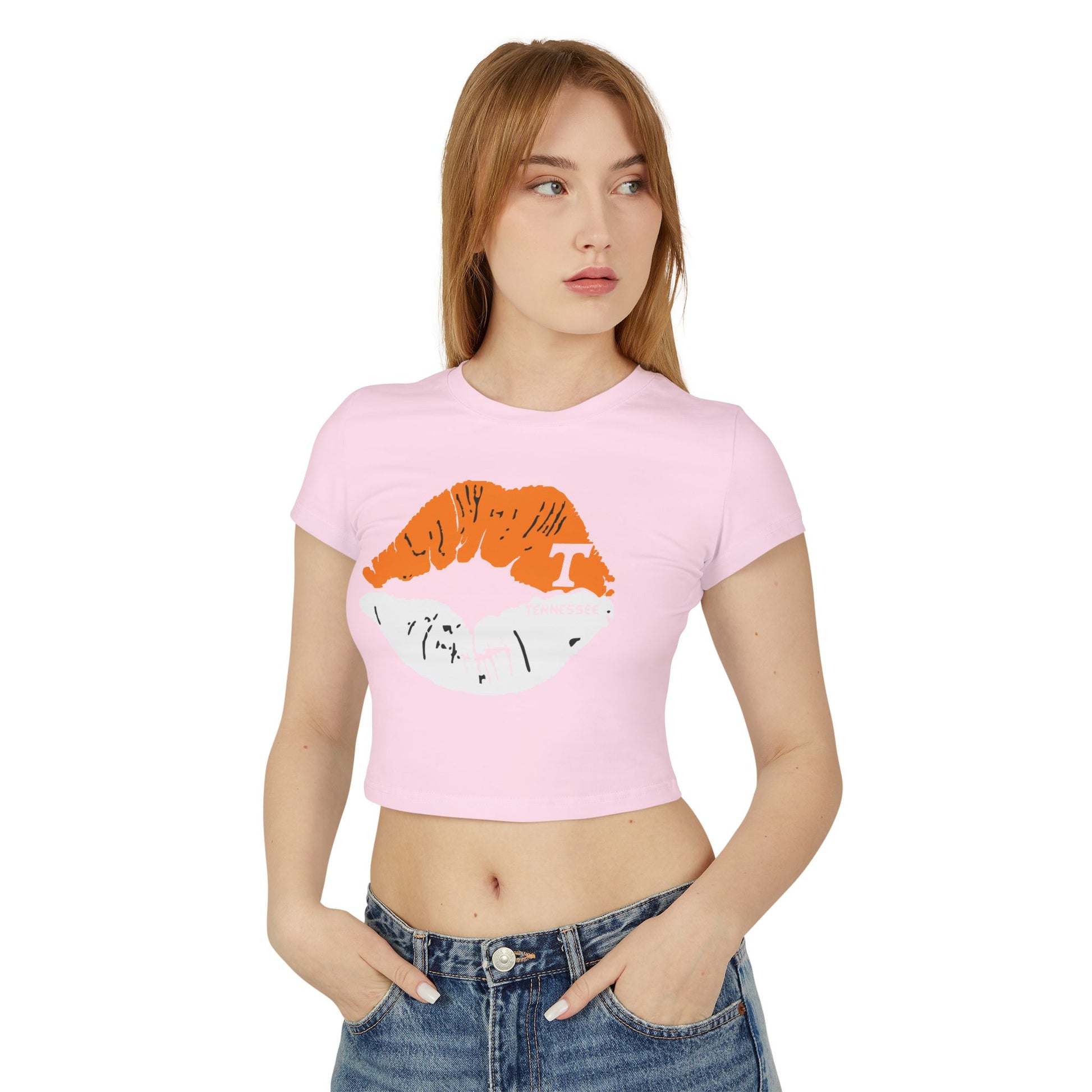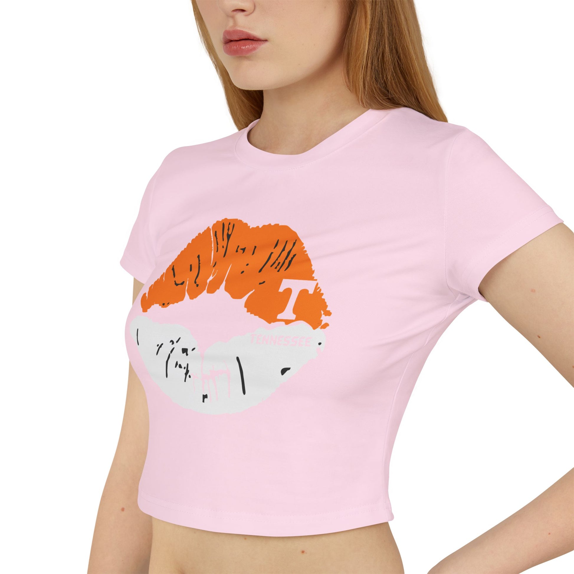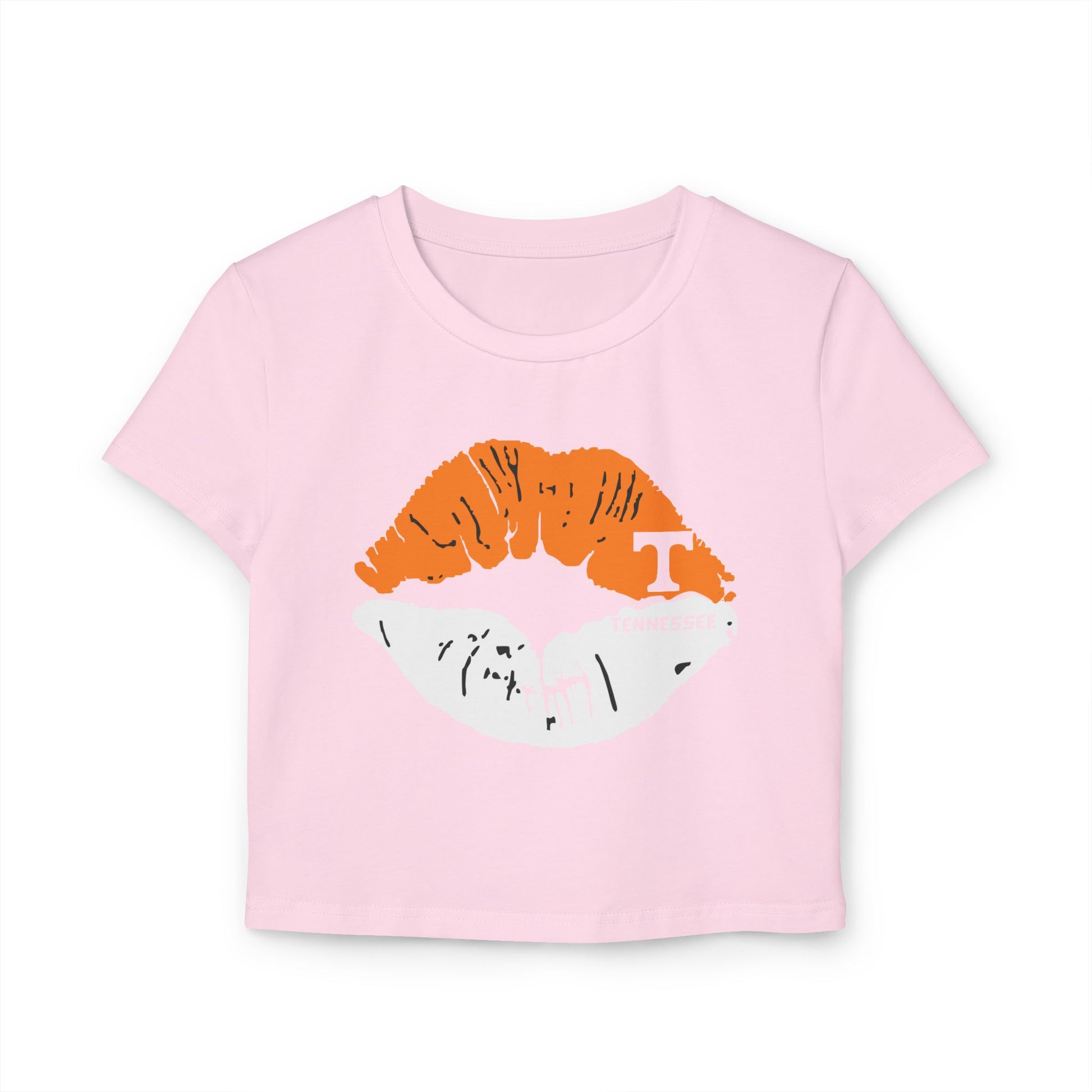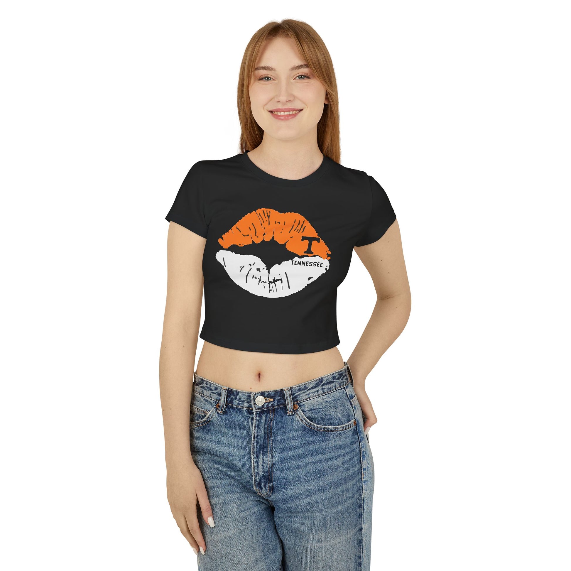 Stylish Tennessee Vols Women's Baby Tee with Lip Print, perfect for casual outings. Ideal gift for her on birthdays or Valentine's Day. Suitable for everyday wear, giving off trendy vibes. Target audience: Female fans of Tennessee Vols and fashion-forward individuals. Relevant for birthdays, Valentine's Day, casual outings.