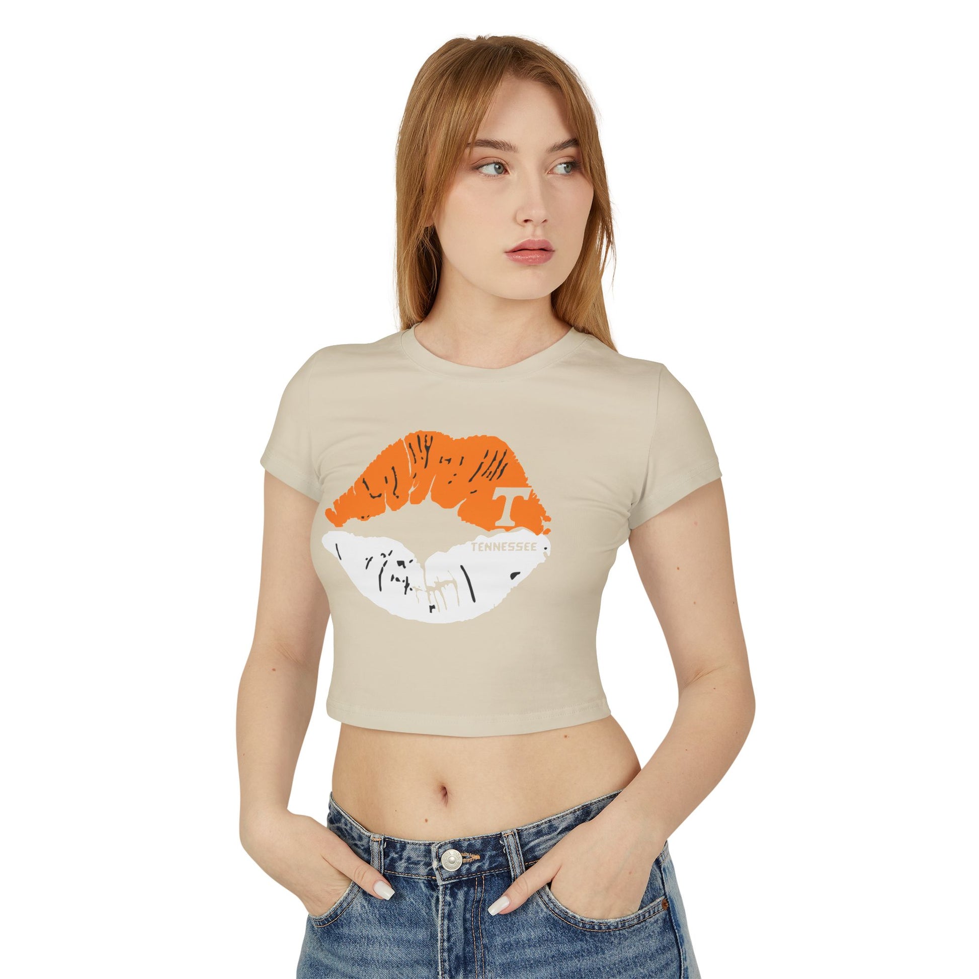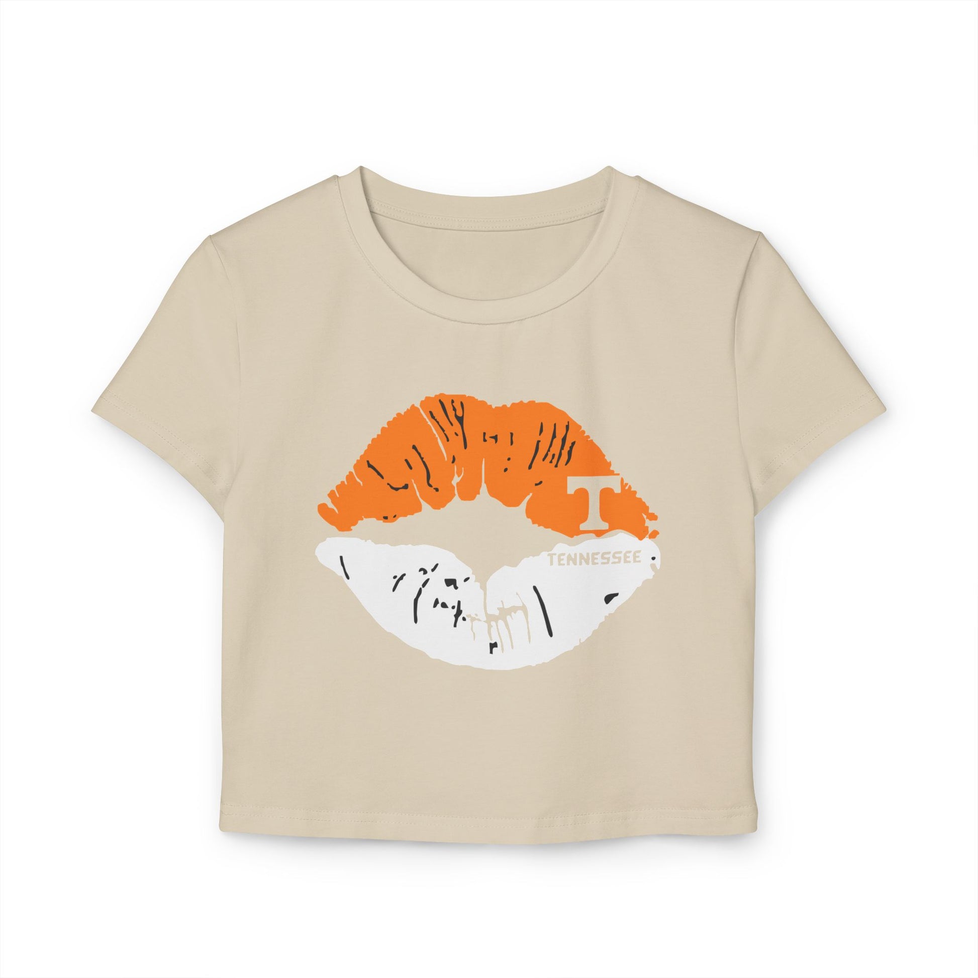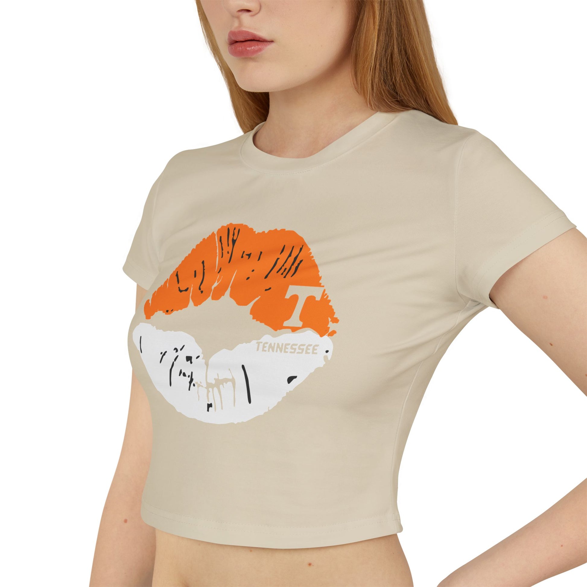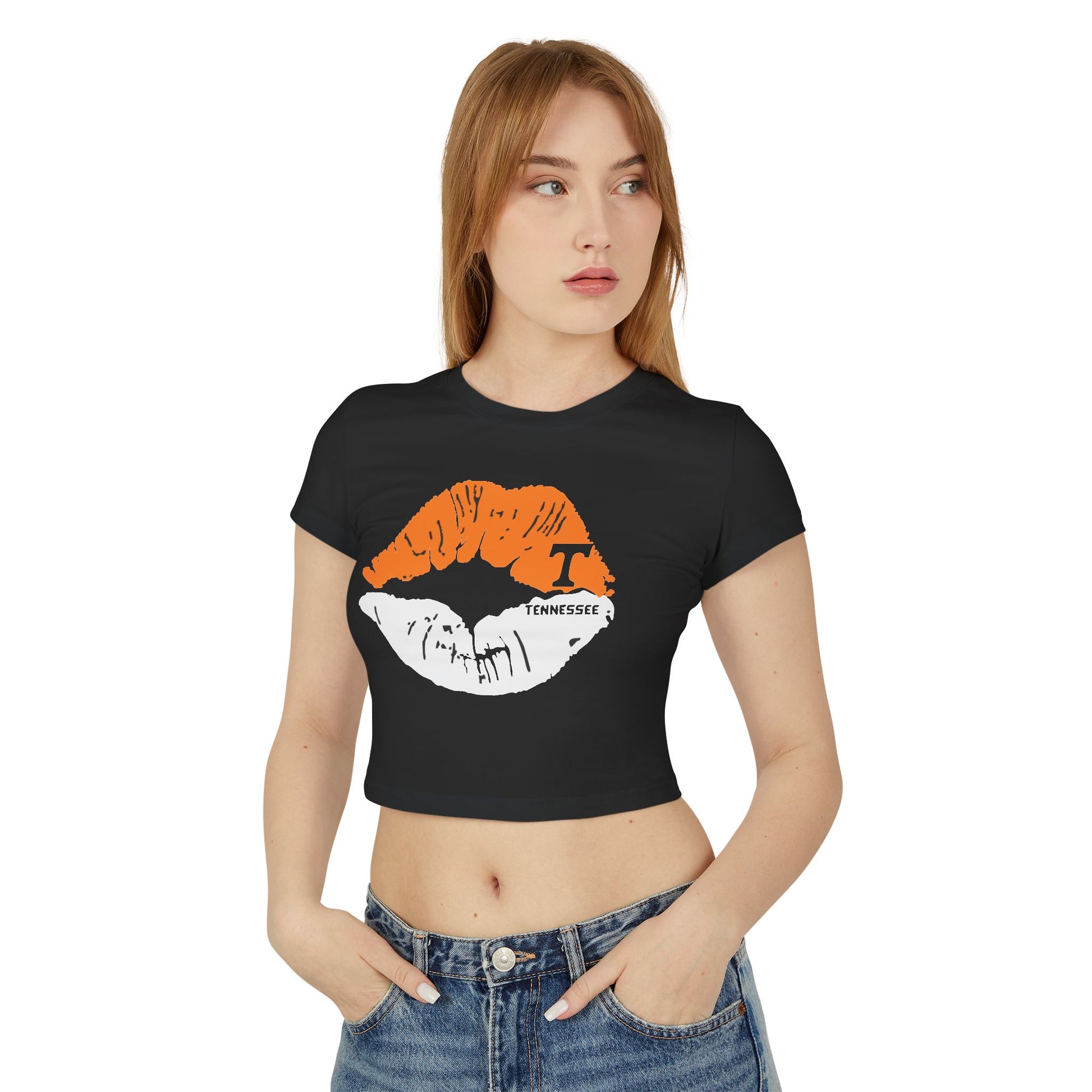 Stylish Tennessee Vols Women's Baby Tee with Lip Print, perfect for casual outings. Ideal gift for her on birthdays or Valentine's Day. Suitable for everyday wear, giving off trendy vibes. Target audience: Female fans of Tennessee Vols and fashion-forward individuals. Relevant for birthdays, Valentine's Day, casual outings.